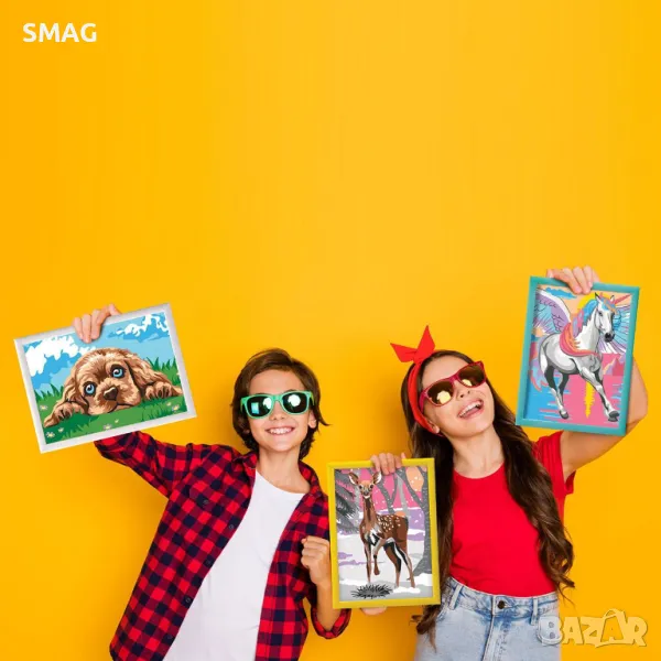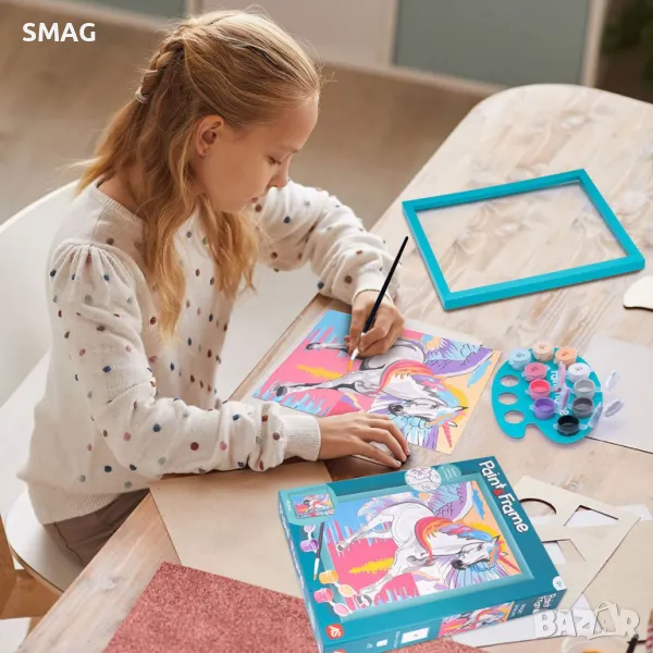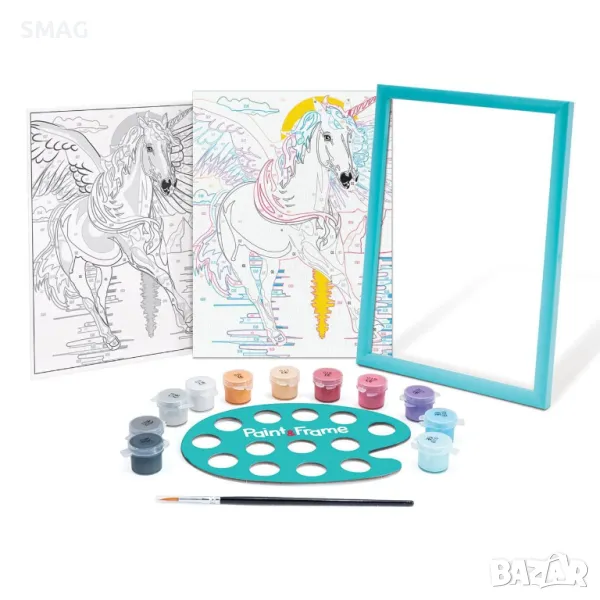 Комплектът включва предварително отпечатан картон, с обозначени всяка точка с номер на кой цвят съответства. Детето вижда кой цвят отговаря на всяка област и го рисува съответно. Резултатът е много задоволителен, тъй като оцветяването на картона е ръководено. Новата серия Paint & Frame Painting е идеалният избор за истински произведения на изкуството! Украсете стаята си със собствено произведение на изкуството! Рисуване по номера с готови акрилни бои. С Paint & Frame, която се основава на техниката за рисуване цвят по номер, вие се научавате да оцветявате в детайли всички точки на вашата предварително отпечатана карта, като по този начин подобрявате своя артистичен талант и развивате фините си двигателни умения. Крайният резултат ще създаде чувство на радост, гордост и удовлетворение! Почувствайте гордост от своя шедьовър, поставете го в рамката му и украсете стаята си с него. Комплектът включва: - 1 предварително отпечатана картон с дизайн на еднорог, 11 акрилни бои в пластмасови бурканчета, пластмасова рамка и четка.