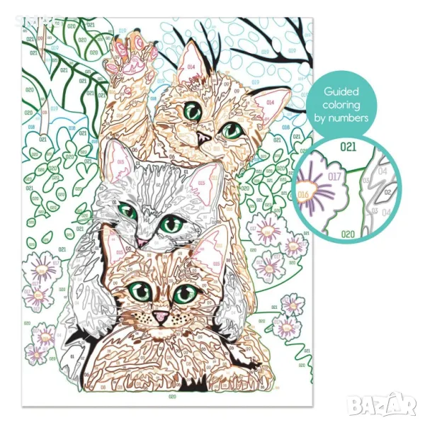 Рисуване по номера с готови акрилни бои. С Paint & Frame, която се основава на техниката за рисуване цвят по номер, вие се научавате да оцветявате в детайли всички точки на вашата предварително отпечатана карта, като по този начин подобрявате своя артистичен талант и развивате фините си двигателни умения. Крайният резултат ще създаде чувство на радост, гордост и удовлетворение! Почувствайте гордост от своя шедьовър, поставете го в рамката му и украсете стаята си с него. Комплектът включва: - 1 предварително отпечатана картон с дизайн на котка, 16 акрилни бои в пластмасови бурканчета, пластмасова рамка и четка.
