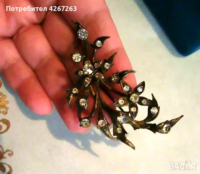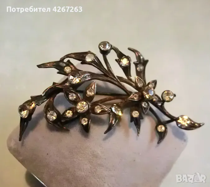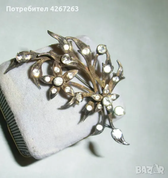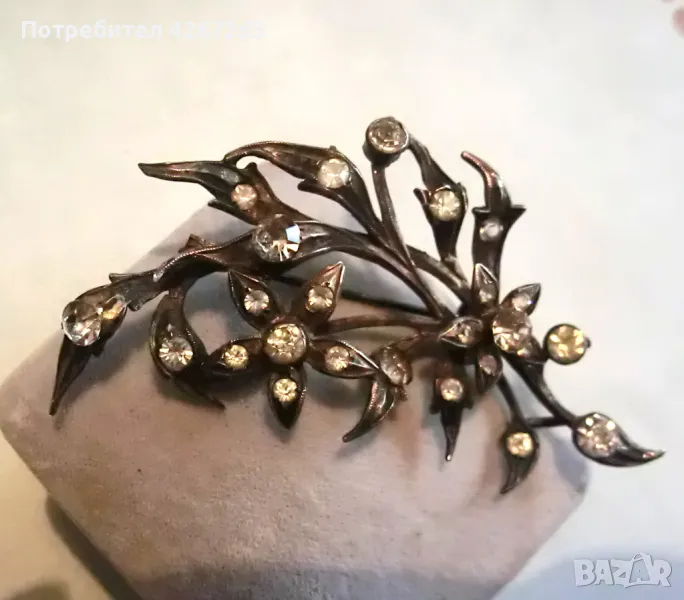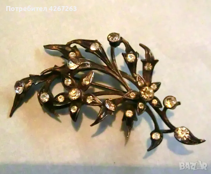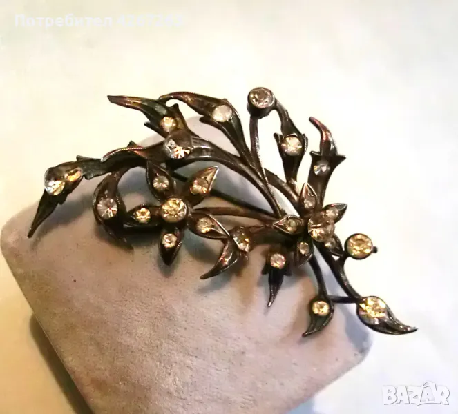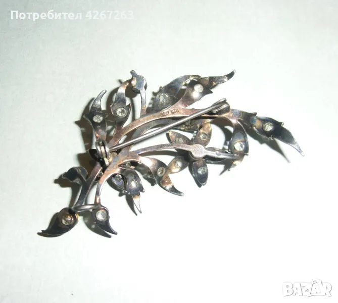 Антикварна сребърна брошка във формата на букет, с кристали, със солидна патина на времето. Около 6.5см. Здраво закопчаване. Маркировки. Уникална и рядка.