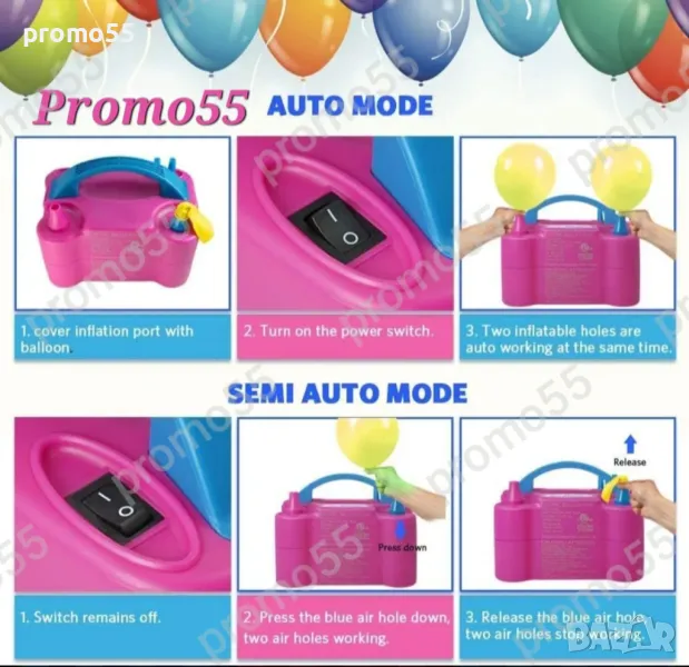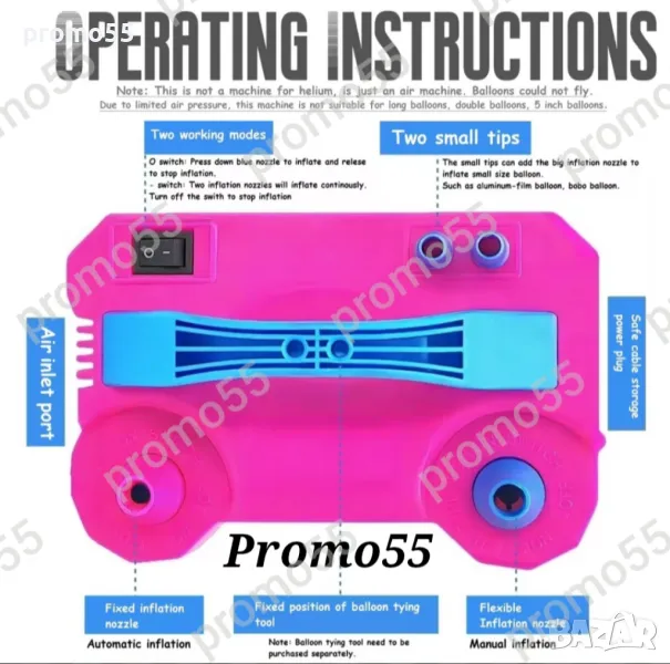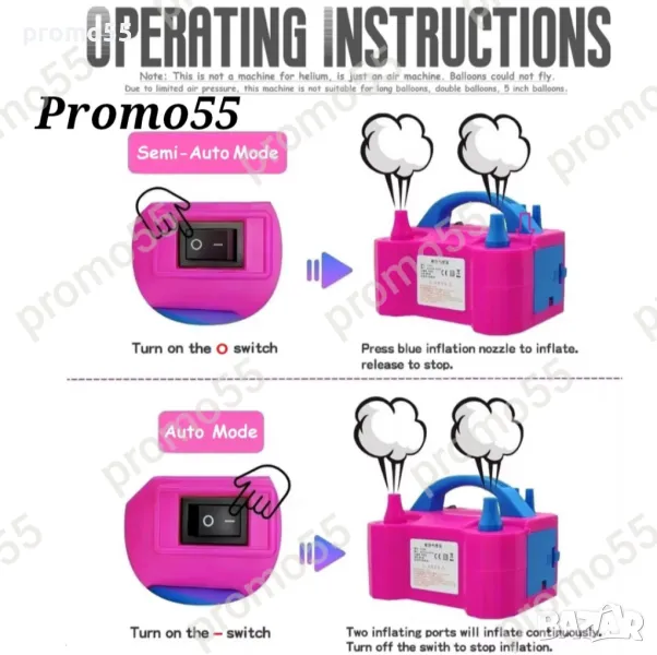 Електрически компресор за надуване на балони с два режима на работа - автоматичен и ръчен. Завъртете превключвателя на позиция ”I” за автоматичен режим, за да осигурите непрекъсната скорост на надуване от ДВЕТЕ дюзи едновременно. Завъртете превключвателя на позиция ’O’ за надуване при поискване, т.е., като натиснете надолу синята дюза, когато е необходимо надуване, отново ДВЕТЕ дюзи ще осигурят въздух за надуване едновременно.