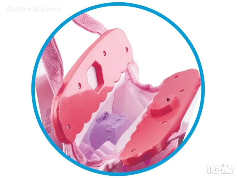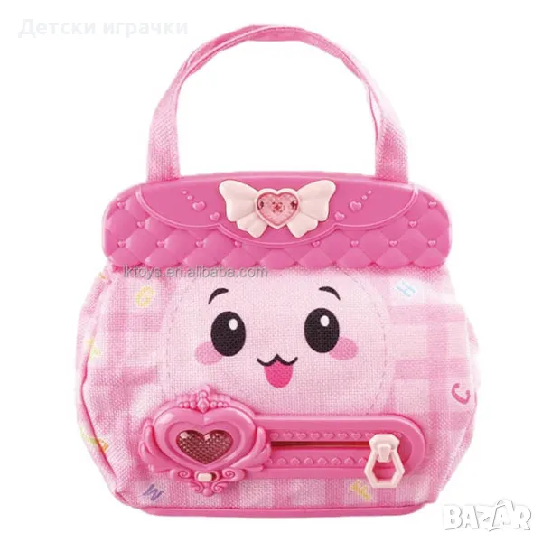 Съдържа: 1 мини бляскава дамска чанта в розово със светлина и различни звуци, място за аксесоари, дръжки и текстилен дизайн с пластмасови части и други готини детайли.