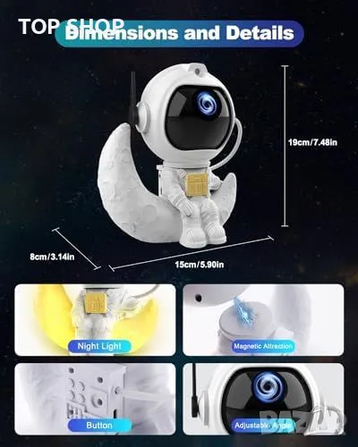 Проектор във форма на астронавт с магнитно закрепена глава, която се върти за настройка на ъгъла на проекция