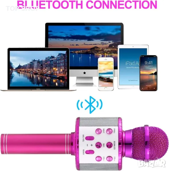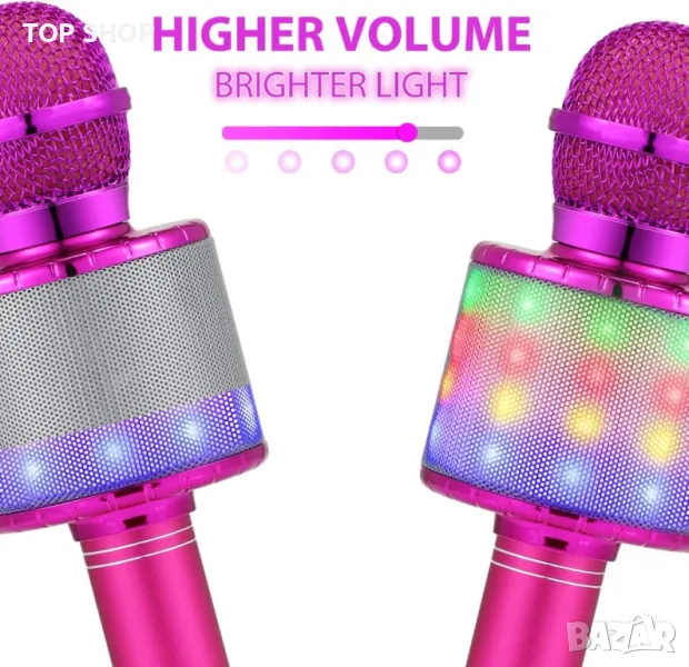 【Безжичен микрофон с Bluetooth】---Преносимият безжичен микрофон може не само да пее, но и да възпроизвежда музика като плейър по всяко време, което не само увеличава атмосферата, но и носи забавление на децата. 3D съраунд, висока съвместимост, поддържа до 32GB micro SD карта (не е включена).