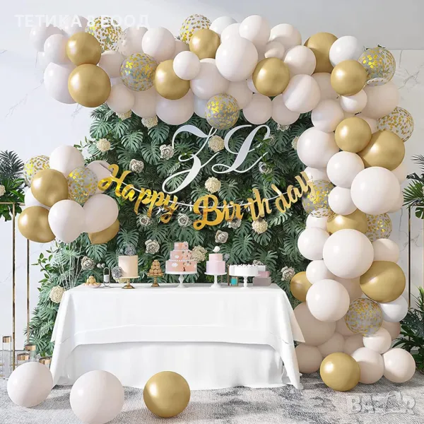 80 бр златни балони с златни конфети, бели и златни 2 панделки