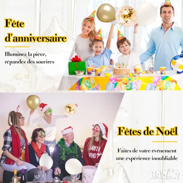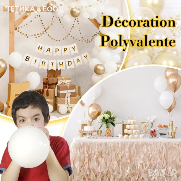 Ще получите 80 броя балони от бяло злато, включително 25 броя 12-инчови златни балони, 15 броя 12-инчови бели балони, 10 броя 12-инчови метални латексови балони, 10 броя 5-инчови балони или 10 броя 5-инчови бели балони, 2 ролки връв
