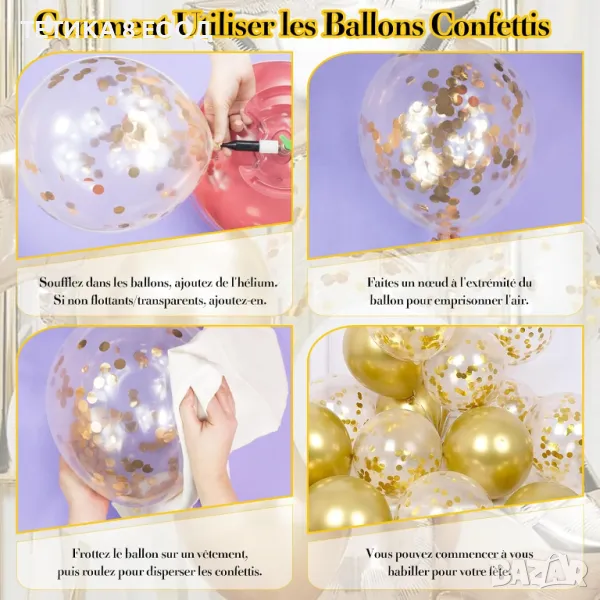 Металният балон Confetti се пълни лесно с въздух или хелий, латексовите балони могат да се надуват, Можете да разклатите конфетите вътре в златния и бял балон, когато спукате балона В края на партито, разпръснатите конфети ще оставят дълбоко впечатление