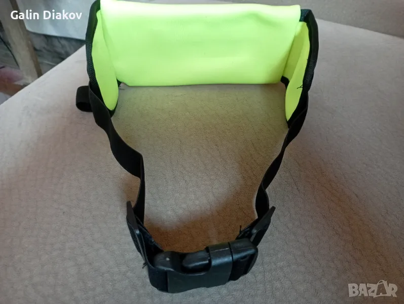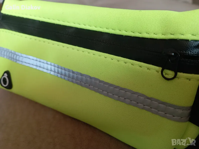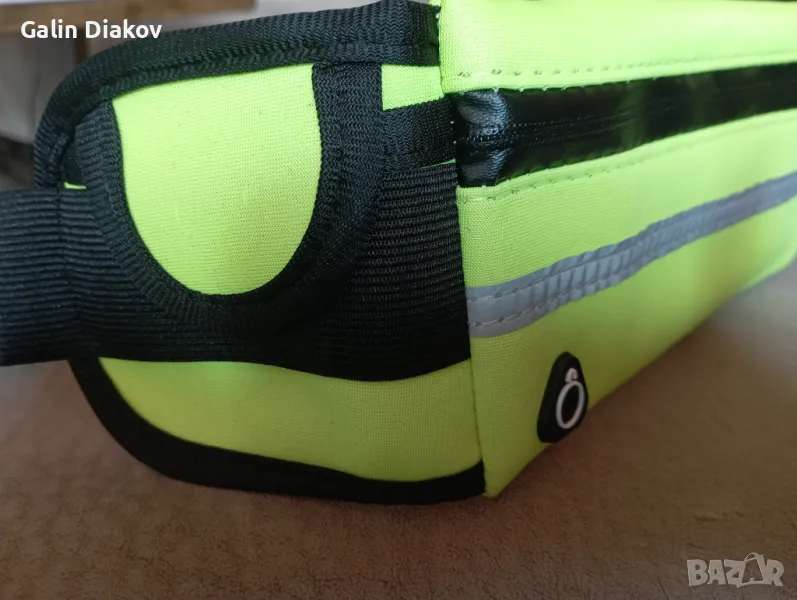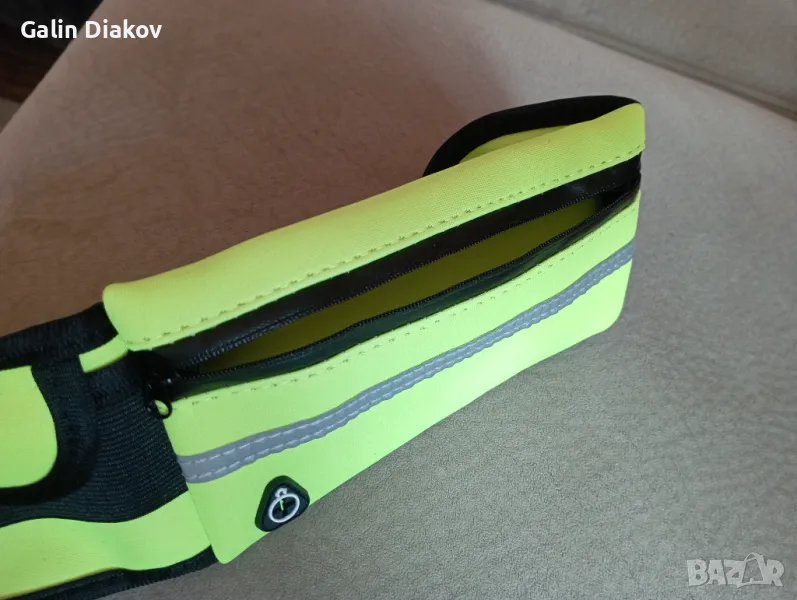 Компактна и ергономична чанта за бягане. С водоустойчив джоб за телефон, с извод за слушалки, отделение за ключове и монети, както и ластичен джоб за бидон с течност. Коланът е ластичен с допълнителна регулация. В ярък електриково жълт цвят и сигнална лента за допълнителна безопастност. Чисто нова.