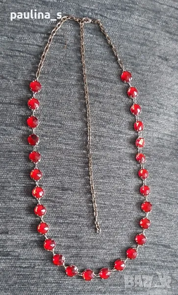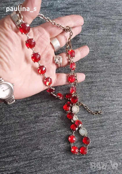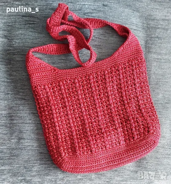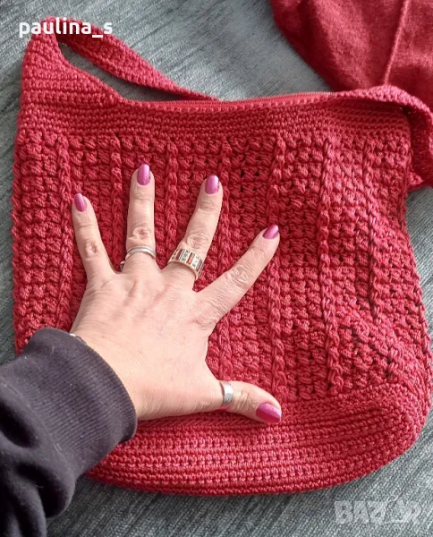 Комплект / Лот от червена чанта, ръчна изработка на една кука, с хастар. Преждата е от восъчен конец, моделът е за през тялото, като дръжката може да се върже индивидуално за скъсяване. Ширина 26см / Дълбочина 20см / Дъно 9см. Коланът е от метални елементи с вковани камъни. Дължина 93см / Дължина на частта с камъни и орнаменти 48см. Предпочитам артикулите да не се делят. Цената е крайна.