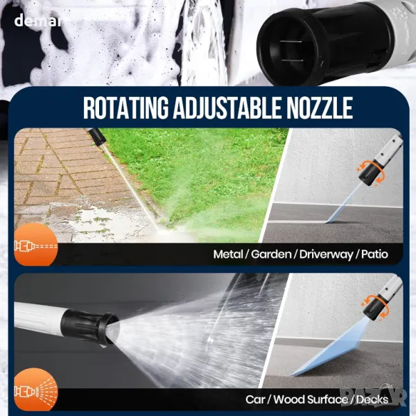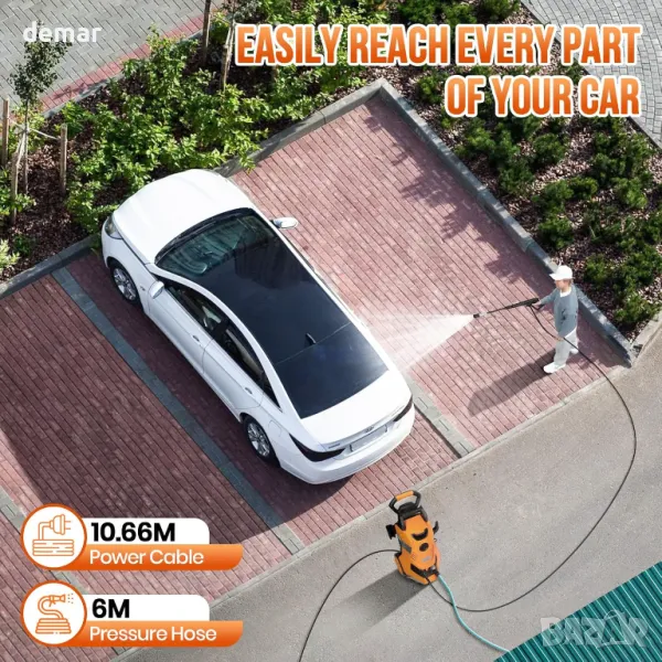 Тази електрическа машина за миене под налягане осигурява водно налягане от 160 бара с поток от 7,5 л/мин, осигурявайки ефективно дълбоко почистване, като същевременно пести вода и енергия. Разполага с регулируема на височина телескопична дръжка за удобство на потребителя и приставки за бързо свързване за лесна настройка. Проектиран за различни повърхности, той почиства алеи, вътрешни дворове, палуби, тротоари и дори вертикални повърхности като гаражни врати и