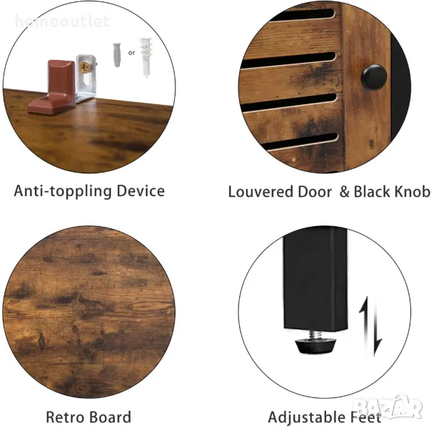 4 регулируеми крачета поддържат този шкаф хоризонтално и стабилно, дори на неравни подове и предпазват пода от надраскване.