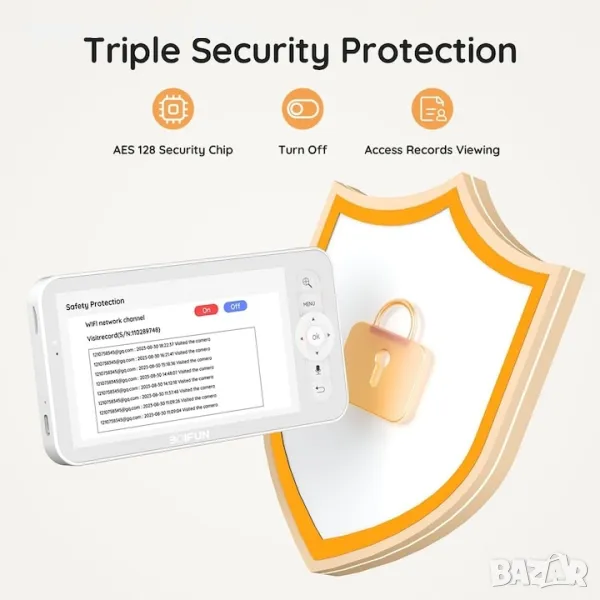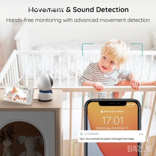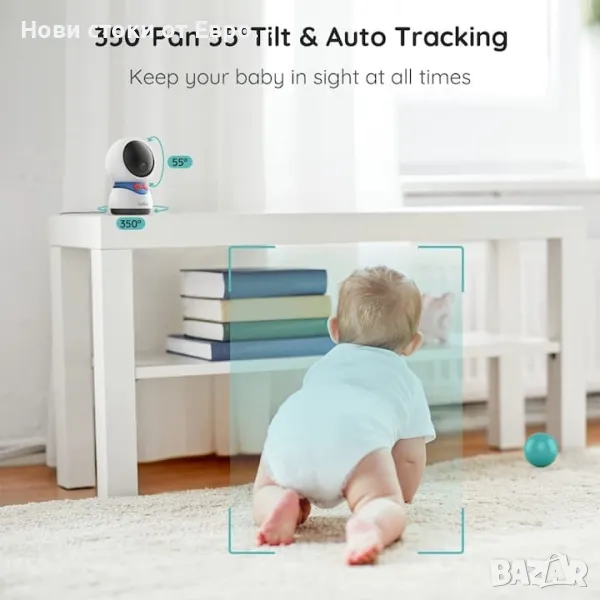 BOIFUN видео бебефон, 5'' 1080P, детекция на движение и звук, нощно виждане, двупосочен звук, PTZ ротация, автоматично проследяванеЕкран и APP Two Control】 Мониторът и камерата са свързани чрез технология No WiFi Needed, камерата може да бъде свързана към мобилното APP чрез 2,4 GHz WiFi. Позволява ви да използвате родителското устройство, когато сте у дома, и да използвате APP, когато сте в движение【1080P & 4 * увеличение и нощно виждане】 Бебешки видеомонитор BOIFUN има 1080P и 4 * функция за увеличение, която ви позволява ясно да виждате всеки детайл от вашето бебе денем и нощем, никога няма да пропуснете усмивка, прозявка или малко вашето движение на пръстите на краката на детето【360° изглед и автоматично проследяване】 Монитор с бебешка камера BOIFUN С функция за широкоъгълно завъртане можете лесно да видите цялата стая на 360 градуса. когато засече движението на обекта, камерата автоматично ще следва въртенето на обекта, за да ви помогне Винаги да държите детето си под око.Многопотребителско наблюдение и двупосочно аудио】 Чрез споделяне на QR кода, мониторът с бебешка камера BOIFUN позволява на всеки член на семейството, който е изтеглил приложението BoifunCam, да вижда и чува очарователните моменти на бебето