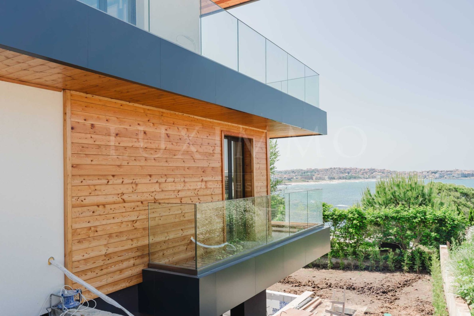 Имотът е разпределен на три нива с асансьор. Фасадата е модерна, от стъкло и дърво с топли, земни и естествени цветове, къщата е с елегантна визия и множество удобства.