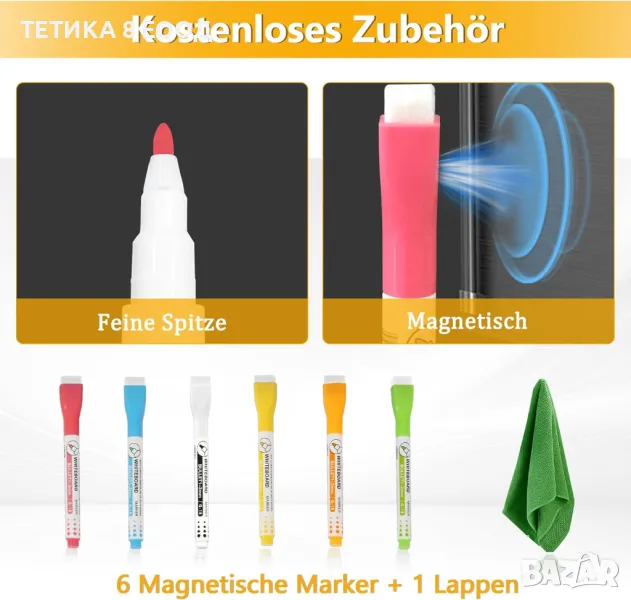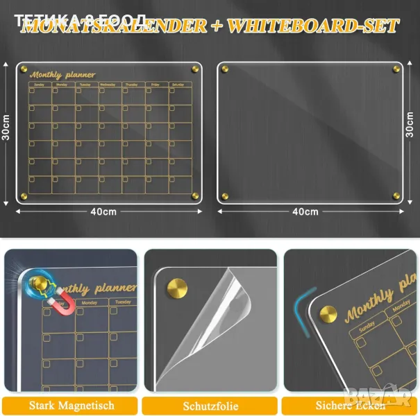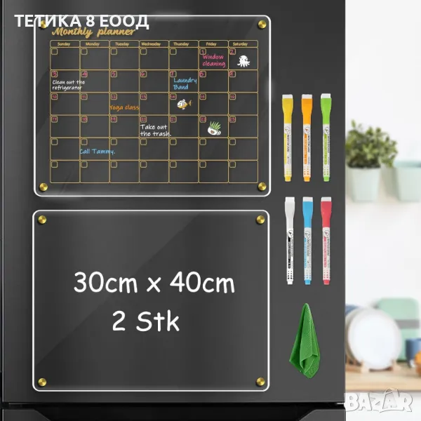 Магнитният акрилен календар за хладилник със сухо изтриване има 4 силни магнита, които осигуряват здраво захващане на вашия хладилник или всякаква плоска метална повърхност (с изключение на хладилниците от неръждаема стомана). Не е необходим монтаж, просто го поставете върху равна повърхност за незабавна употреба. Заема малко място и лесно се маха, което го прави удобен и практичен инструмент за организиране на ежедневието ви.