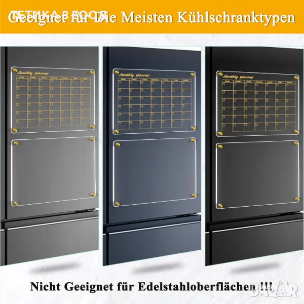 Изработен от прозрачен и плътен акрилен материал, този хладилен календар е едновременно издръжлив и стилен. Прозрачната плоча няма да разруши външния вид на вашия хладилник и се почиства лесно. С дебелина от 3 мм, той е устойчив на надраскване и счупване. Със своя магнитен гръб той може да се използва като месечен или седмичен планер, график, списък за пазаруване или табло за съобщения и добавя нотка елегантност към вашия хладилник.