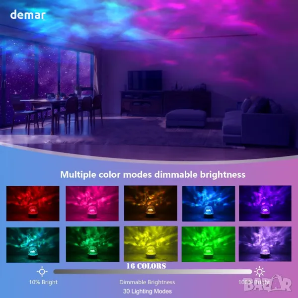 Този проектор Aurora с овален дизайн предлага 360° таванна проекция с 16 цвята, 30 режима на осветление и шест нива на яркост, което позволява персонализиране за различни атмосфери. Той разполага със сензорен превключвател и дистанционно управление за лесни настройки, включително промени в цвета, яркост и различни светлинни ефекти като скачане, светене и избледняване. Уникалният кубичен дизайн обгражда стаята с преливащи светлинни вълни, имитирайки Северното сияние за хипнотизиращо изживяване. Служейки както като галактична светлина, така и като нощна светлина, тя осигурява живи цветове заедно с бяло и топло осветление за уютна атмосфера. Подходящ за спални, домашни кина, събирания и празнични поводи, той подобрява всяко пространство и е идеален подарък.