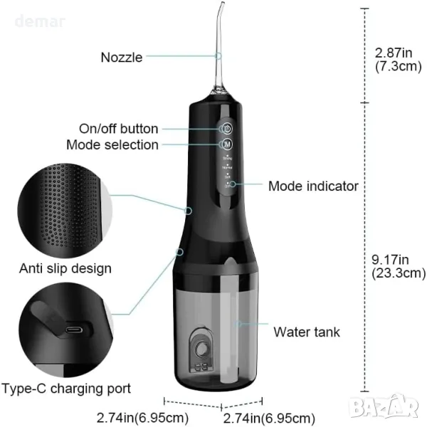 Зъбен душ, преносим иригатор за устна кухина, USB акумулаторен, черен