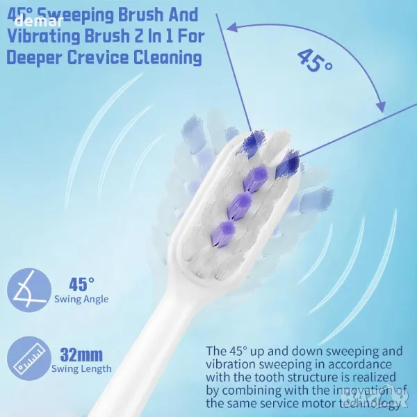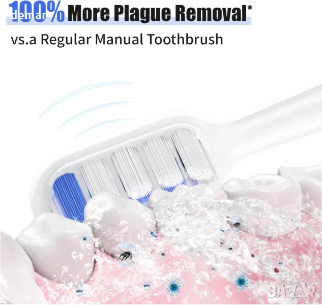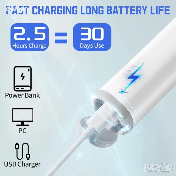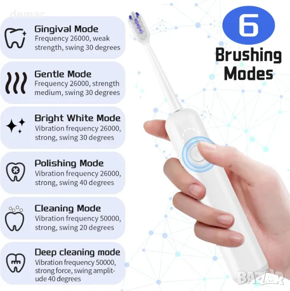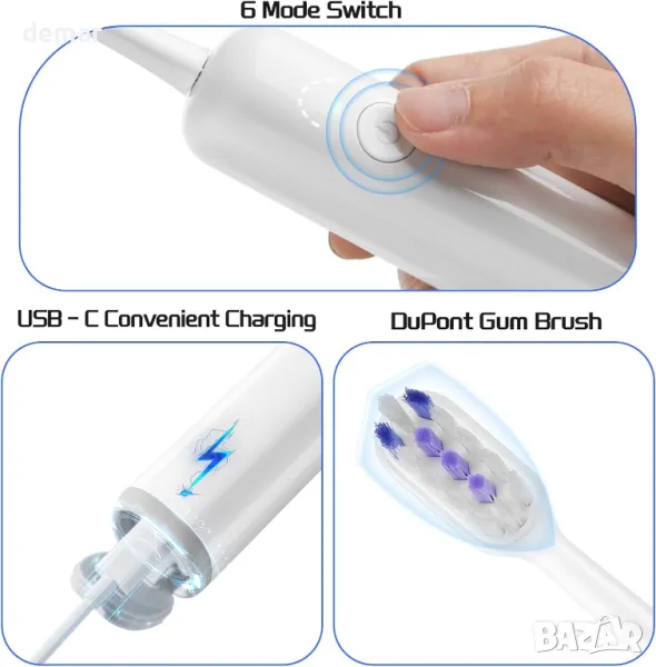 Тази усъвършенствана звукова четка за зъби премахва до 10 пъти повече плака от ръчна четка и помага за избелване на зъбите за една седмица. Вибрира 26 000-50 000 пъти в минута за цялостно почистване с минимален шум и вибрации на ръцете. С три сменяеми глави на четка, издържащи девет месеца, той предлага 30-дневен живот на батерията след само 2,5 часа USB-C зареждане. С шест режима на четкане, включително грижа за венците, нежно, избелване, полиране, почистване и дълбоко почистване, той отговаря на различни нужди от грижа за устната кухина. Вграденият интелигентен таймер осигурява препоръчано от зъболекаря двуминутно миене на зъбите с 30-секундни квадрантни напомняния. Неговият IPX7 водоустойчив дизайн позволява лесно изплакване, което го прави идеален за употреба у дома или при пътуване.