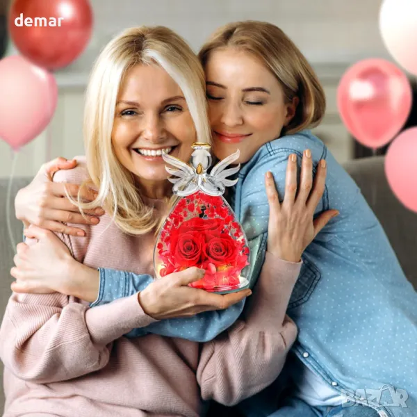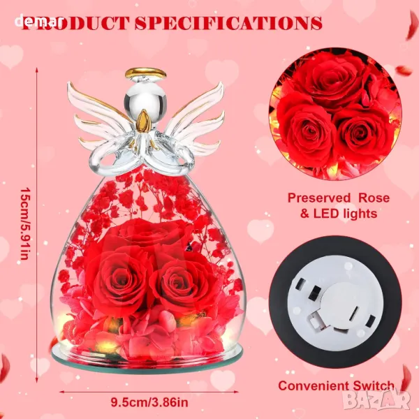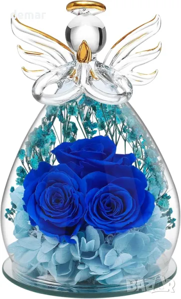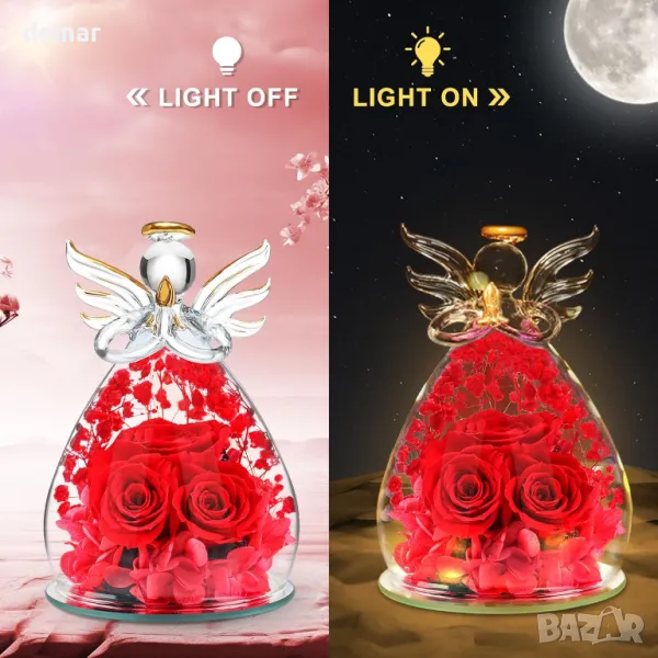 Ръчно изработен стъклен ангел със запазени рози символизира вечната любов и защита, с кристално чист дизайн за елегантно докосване. Вградените LED светлини подчертават красотата му, което го прави подходящ подарък за майки, съпруги, баби и любими хора при специални поводи като Ден на майката, рождени дни и годишнини. Запазената роза не изисква поддръжка, което гарантира дълготраен чар. Освен като подарък, той служи като изтънчена декорация за жилищни пространства, добавяйки топлина и романтика. Представлявайки благодарност и защита, това е значим спомен за отбелязване на специални моменти.