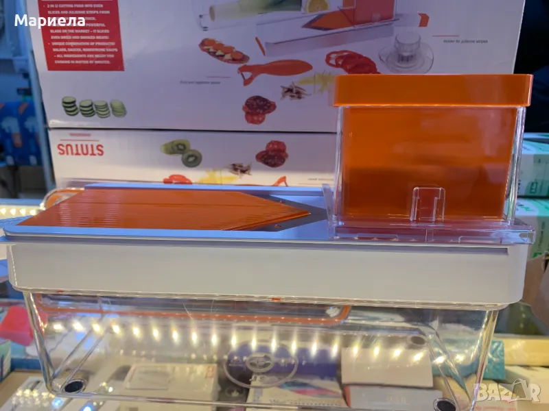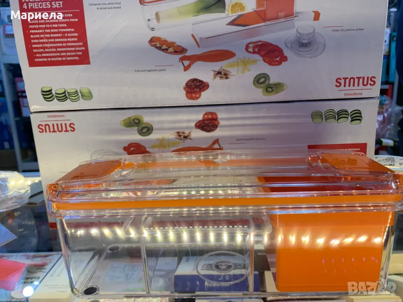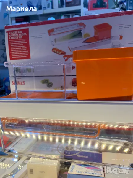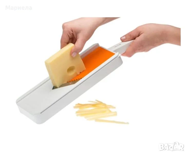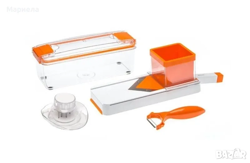 Комплектът включва V-образно ренде, шапка за безопасно хващане, контейнер за съхранение на нарязани храни и белачка за плодове и зеленчуци. Неговата добавена функция за нарязване на кубчета/ленти ще улесни работата дори на най-опитния домашен готвач.