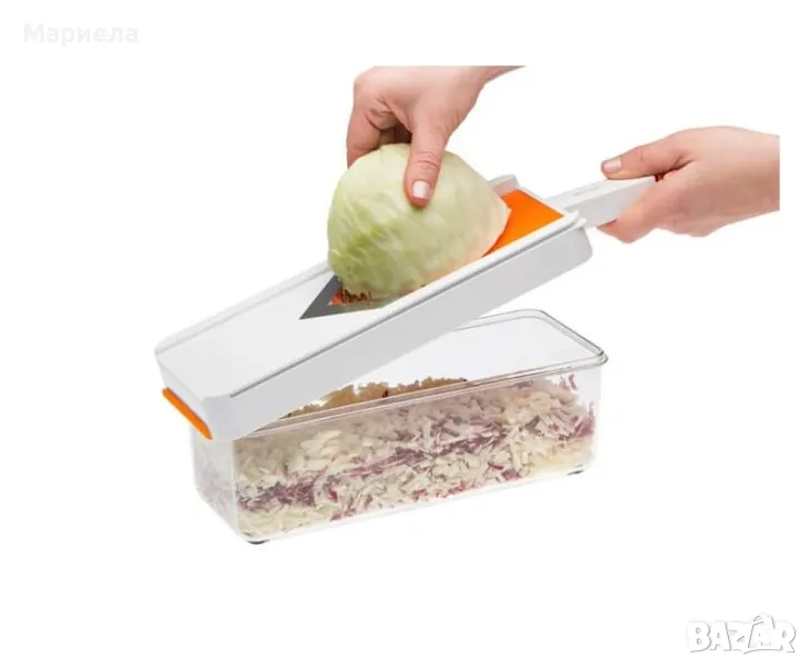 Включеният пластмасов контейнер пасва перфектно на слайсера и стои стабилно на повърхността по време на нарязване. Храната се нарязва директно в съда, без никакви парчета да се разхвърчат наоколо. Подходяща е за съхранение, сервиране и транспортиране на нарязани зеленчуци и други храни, тъй като има херметичен капак.