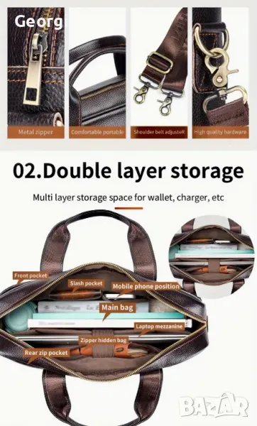 Като можем да добавим и събирането на много лични вещи, документи и вместимост за лаптоп 15.6”. Чантата притежава удобни външни джобове, свалящи се презрамки, луксозни ципове (4 на брой) и модерни аксесоари.