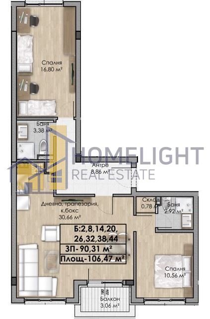 Хоум Лайт предлага на Вашето внимание просторен, слънчев, тристаен апартамент в новостроящ се жилищен комплекс от затворен тип в старата част на кв. Овча купел, на границата с кв. Павлово и кв. Бъкстон. Район с отлична инфраструктура. В близост до спирки на градски транспорт, магазини, спортен комплекс Славия, парк Славия, училища, детски градини и др. Комплексът е съвкупност от три самостоятелни жилищни сгради (Сграда 1, 2 и 3), разположени на парцел с площ от 7 812 кв.м. от който се разкрива изключителна гледка към планина Витоша и изглед непосредствено към река Владайска, към която е обособена крайбрежна алея. На разположение на обитателите ще има СПА център, фитнес, ресторант, малък парк с алеи за разходка и кътове за отдих. Апартамент Б 38 е позициониран на 8-ми жилищен етаж, с изложение юг/изток/север. Площта му е 106,47 кв.м., като чистата застроена площ е 90,31 кв.м., разпределени във входно антре, просторна дневна с кухненски бокс и трапезария, две спални, две бани с тоалетна, складово помещение и тераса. Има възможност за закупуване на единични и двойни, подземни или наземни паркоместа и гаражи. В сградата разполагаме и с други тристайни апартаменти с различна квадратура и на различни етажи и цени.