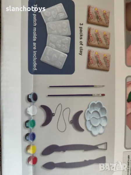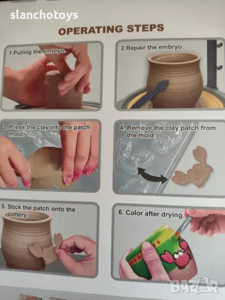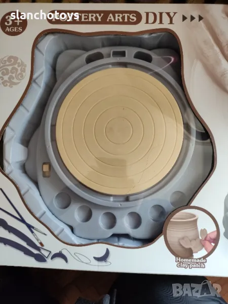 Колелото е комплект с 600грама глина и бойчки. Глина се продава и отделно,във всяка книжарница . Задвижва се посредством 4 батерий АА,не включени в комплекта. Изпращам с Еконт или лично за Сф.