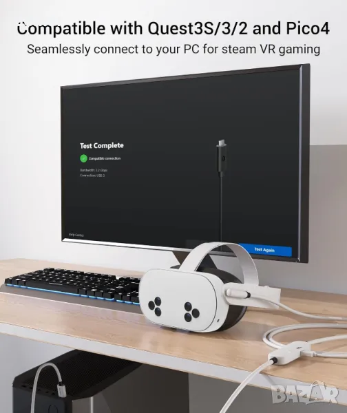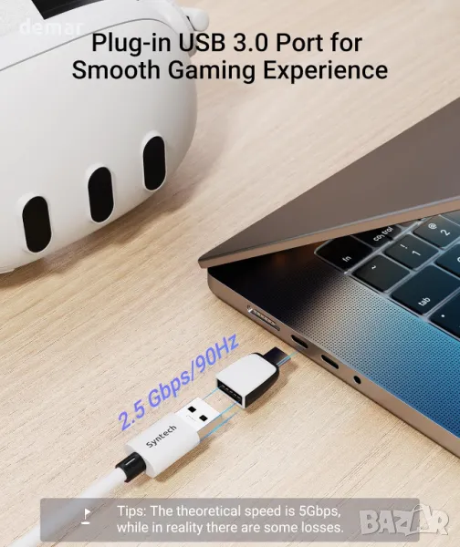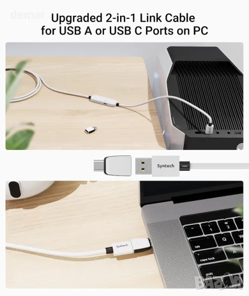 Кабелът за свързване 2-в-1 Syntech 2025 е проектиран за безпроблемна съвместимост с Meta Quest 3S/3/2, осигурявайки стабилна USB 3.0 връзка с компютър при едновременно бързо зареждане. Той включва USB-C към A адаптер за гъвкава свързаност и поддържа скорости на трансфер на данни от 1,9–3,2 Gbps по цялата си дължина от 5 метра, осигурявайки минимално забавяне. С усъвършенстван чип за зареждане 2025, той осигурява до 18 W PD зареждане и автоматично превключва към бавно зареждане при 65% батерия, за да удължи живота. Създаден за издръжливост, той има трислойна защита срещу вода, корозия и електрически утечки, със сигурна велкро лента за предотвратяване на прекъсвания. За оптимална производителност използвайте с PD/QC бързи зарядни устройства и актуализирайте фърмуера.