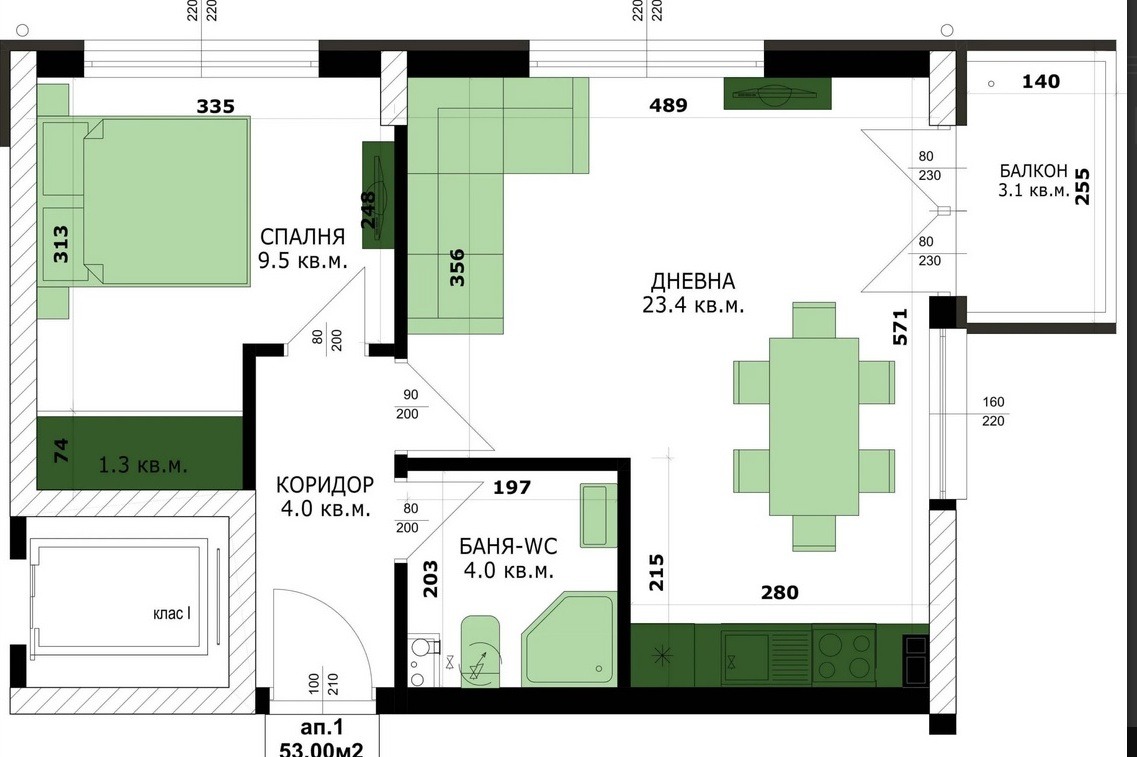 Тристаен апартамент, етаж 2, с площ от 97 кв.м., функционално разпределени във: входно антре, дневна с кухненска част-29,4 кв.м, две спални /13 и 12кв.м./,баня, тоалет и тераса..