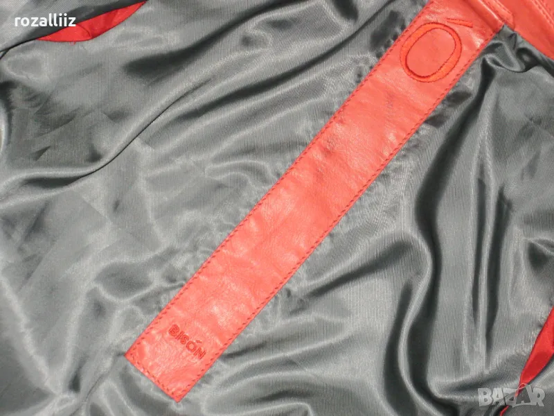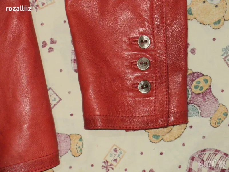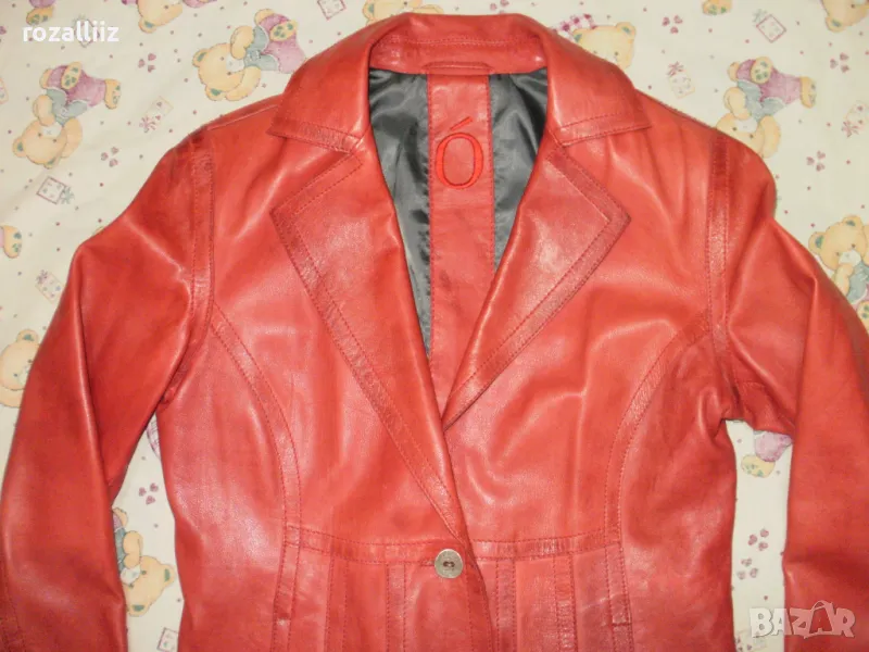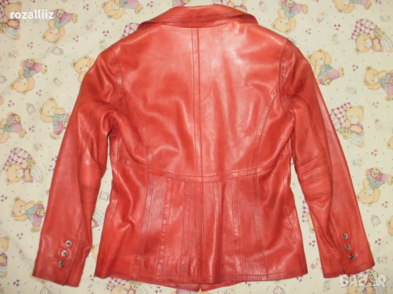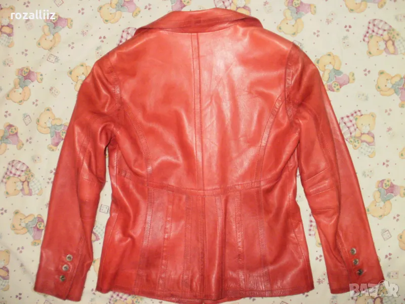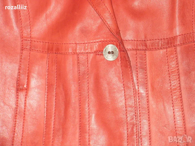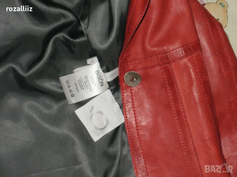 Сакото е на BISON, оригинално, ново от мека естествена кожа. Цвета е като на снимките, доматено червено. По номер е 40, М/L. Леко вталена кройка е, отпред е с красиво копче и по три по малки на ръкавите. Отпред има два джоба, има и един вътршен.