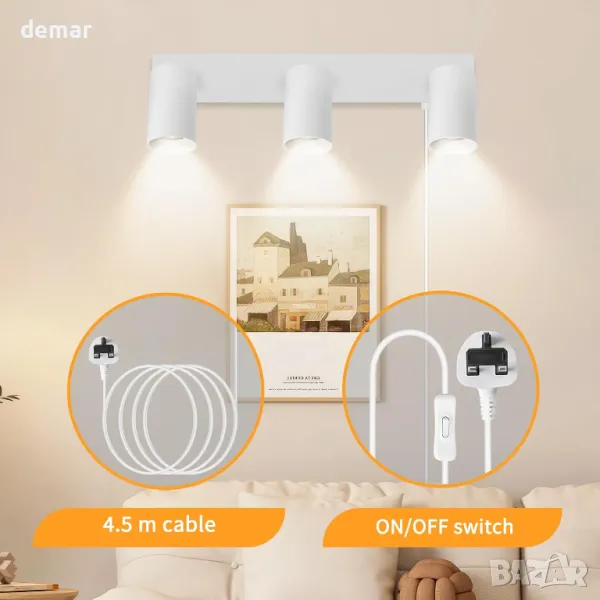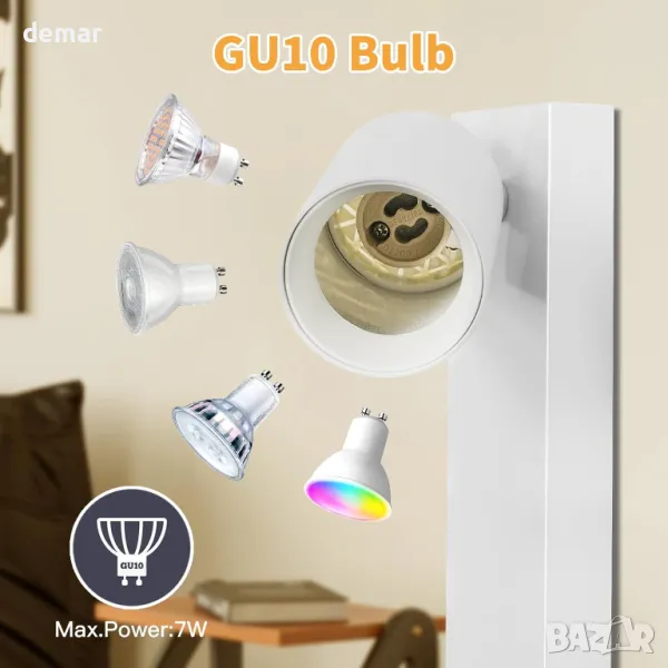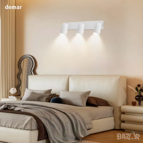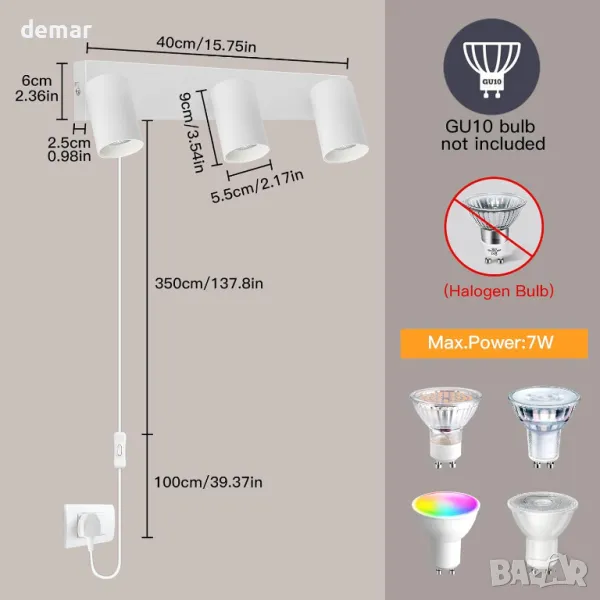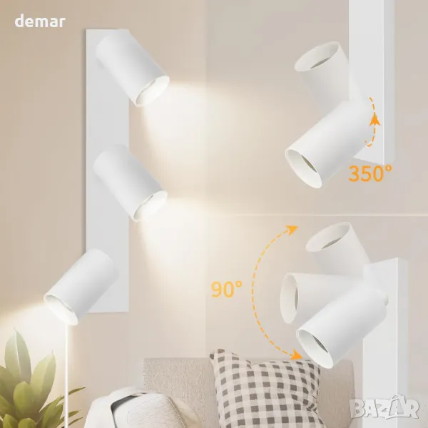Стенна лампа с 4,5 м захранващ кабел за лесна инсталация, включваща удобен ключ за ВКЛ./ИЗКЛ. Изработен от влагоустойчив, устойчив на ръжда метал с матирано бяло покритие. Регулируем дизайн с 350° ротация наляво/надясно и 90° нагоре/надолу за гъвкави ъгли на осветяване. Използва основа GU10 (макс. 7 W, крушката не е включена) с подвижен абажур за лесен монтаж на крушката. Идеален за вътрешни пространства като спални, всекидневни, кухни, офиси, кафенета и хотели.