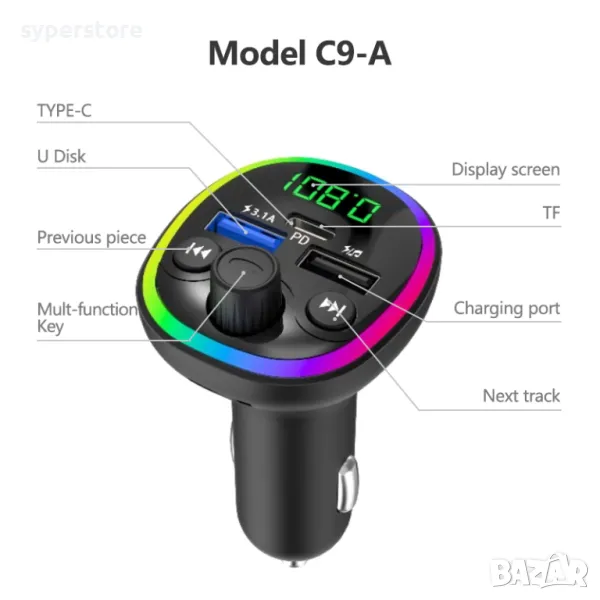 FM трансмитер Блутут Digital One SP00999 C9-A Bluetooth v.5.0 + 2xUSB + Type C 3.1A Поддържа Blue