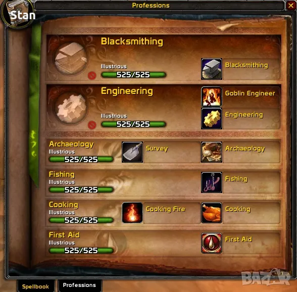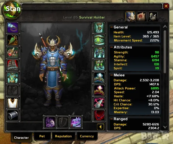 Акаунта има над 14к ачийвмънт точки, всички репутации (classic, tbc,wotlk,cata) са вдигнати на exalted. Има 4 хордски героя на Gehennas warrior/druid/rogue/hunter, но само Warrior-a e вдигнат на 85 и с почти бис гиър за първа фаза(370ilvl), а останалите 3 героя са 80lvl. Бонус към това има и алиански герой на Firemaw (worgen hunter - 365ilvl).
