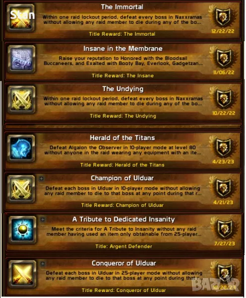 Редки титли като (the insane, of the horde, the undying, the immortal, herald of the titans, champ/conq of ulduar, the argent defender, champion of the naaru, hand of a'dal) - назовавам тези като "редки", тъй като някои от тях вече не могат да се вземат.
