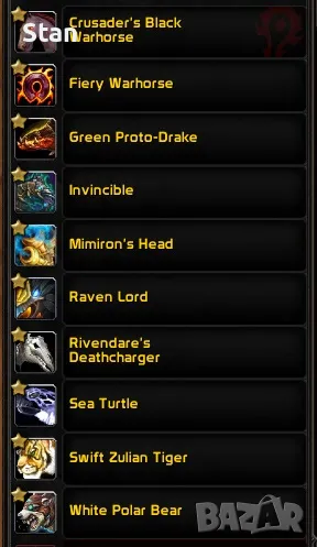 Редки маунтове: Rivendare's Charger, Mimiron's Head, Swift Zulian Tiger, Invincible, Raven Lord, Sea Turtle, Fiery Warhorse, Crusader's Black Horse и още доста...