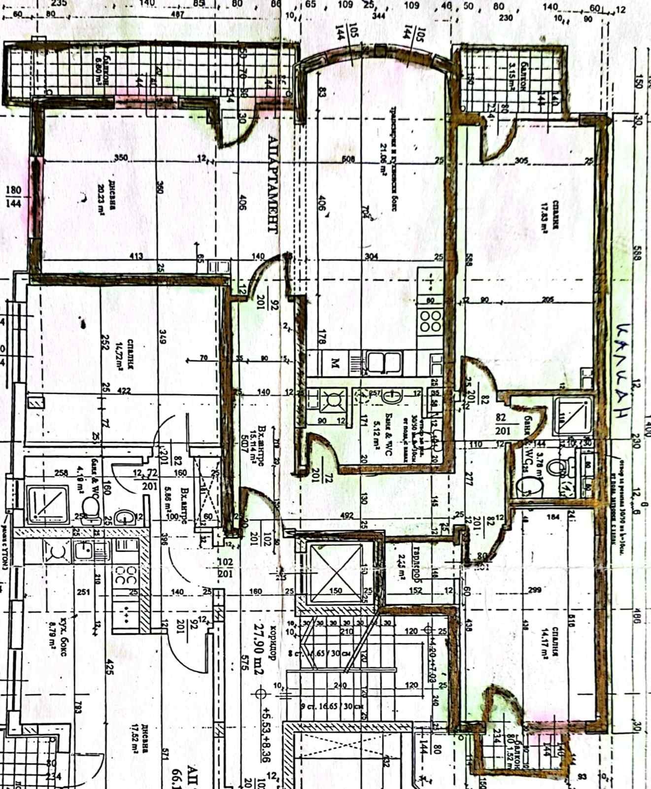 Състои се от просторна всекидневна 42 кв.м. чиста жилищна площ, две спални от по 15 и 18 кв.м, обширен коридор, два санитарни възела, гардеробна, три остъклени тераси с излаз от трите стаи и две изби.