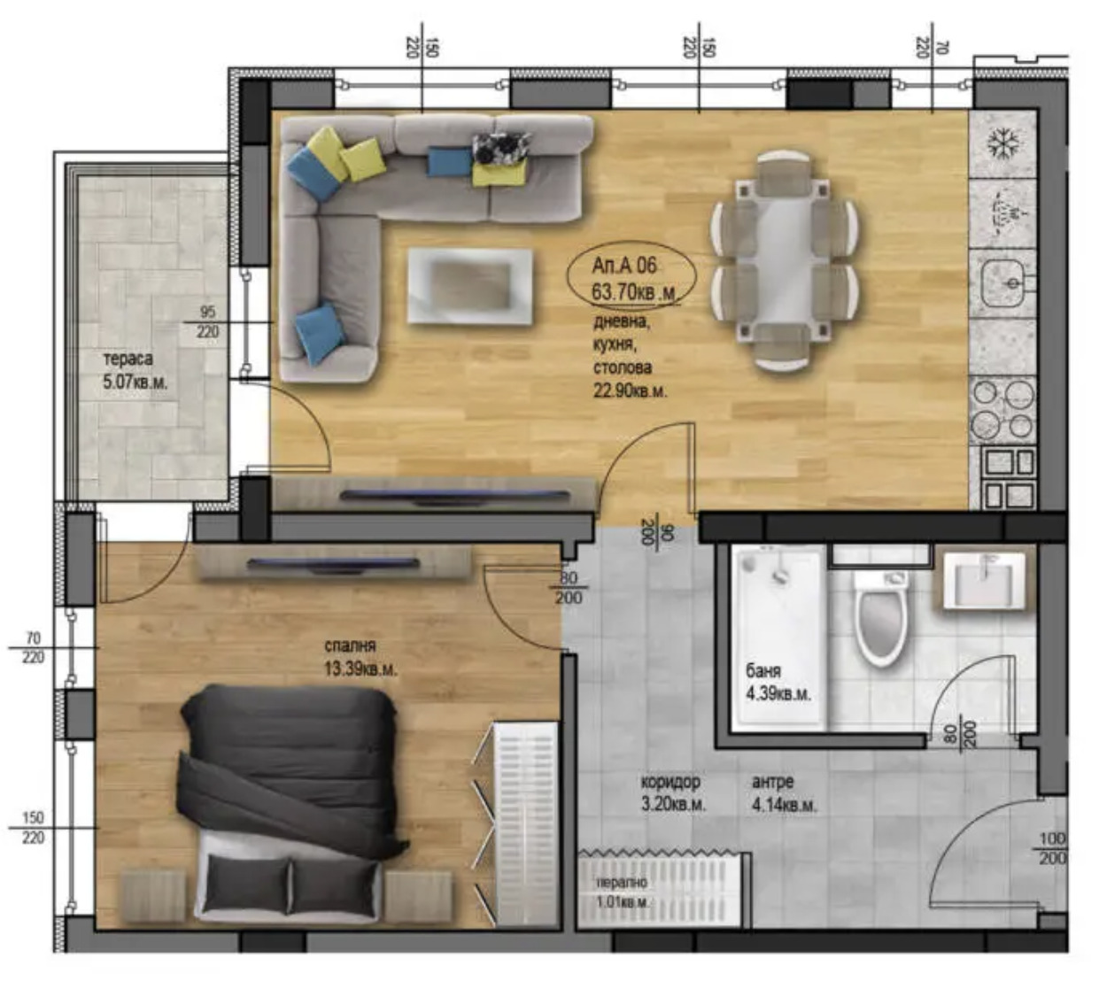 ➡ Апартаментът се състои от входно антре, склад/перално помещение, баня с тоалетна, спалня, дневна с кухня и трапезария, тераса и е с обща площ от 73,99 кв.м.