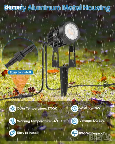 Захранвани от мрежата LED градински прожектори с ярки и стабилни COB чипове, предлагащи надеждно осветление независимо от атмосферните условия. Проектирани за употреба на открито с водоустойчив рейтинг IP65, което ги прави подходящи за вътрешни дворове, пътеки, дворове, алеи и партита. Осигурява както сигурност, така и декоративно топло бяло осветление, подобрявайки ефективно външните пространства.