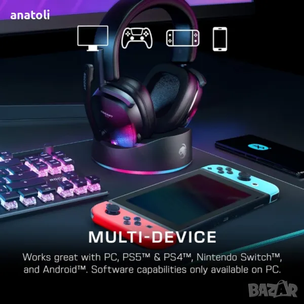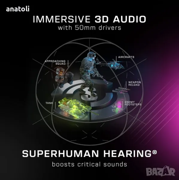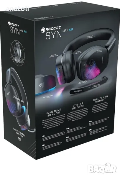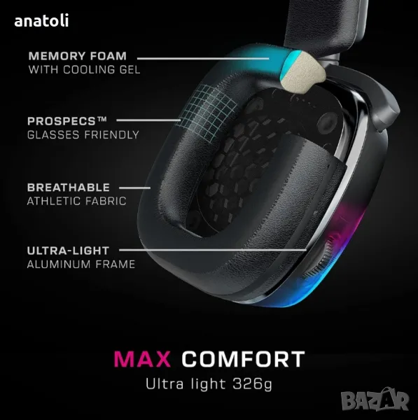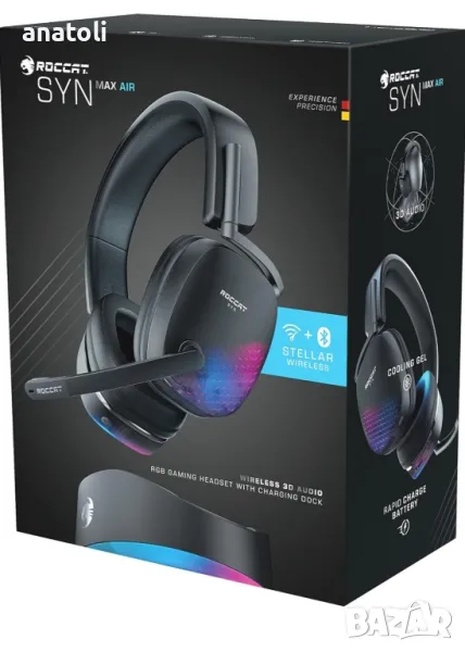 Max Air PC Безжични 3D аудио слушалки RGB игри Stellar Wireless Technology Изключителна сила на сигнала и дълга батерия. Включен док за бързо зареждане Едновременна Bluetooth за смесване в VoIP чат, телефонни обаждания и други Потапящо 3D аудио с 50 мм наноклежни шофьори от плажа на костенурка Разглобяем флип-митров микрофон за кристално-чисто комуникация Удобни проспеци охлаждащи слушалки и перфектно прилепване на лентата за глава Свръхчовешкият слух засилва критичните звуци в играта за допълнителен ръб Трайна и лека алуминиева конструкция Програмното RBG осветление е съвместимо с екосистемата AIMO