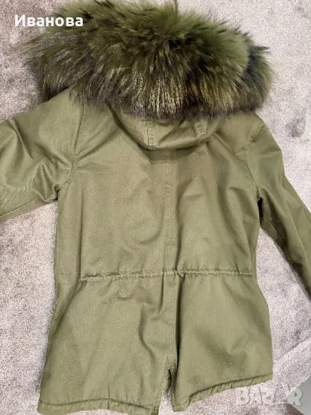 Дамска парка в зелен цвят с богата качулка от естествен косъм лисица. С регулиращи връзки на талията, има мека и топла подплата. Отговаря на