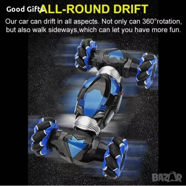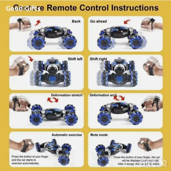 Колата, която може да се управлява от движенията на ръката във въздуха: най -новата миниатюрна кола с две лица, на четири мощни колела, подходящи за катерене или каскади, снабдена със специални ефекти. Действието и забавлението са неограничени, предлагайки на детето прекрасно изживяване при работа и визуални ефекти.Интелигентно дистанционно управление: Дистанционното управление приема 2.4 GHz технология, която е доста чувствителна и можете да я управлявате, като правите движения във въздуха, след като приложите лоста за жестове с ръце. Миниатюрният автомобил включва 7,4V 1400 mAh батерия, свръхголям капацитет и ви позволява да се насладите напълно на всеки момент от шофирането.Дизайн с перфектни гуми: неплъзгащи се гуми, супер еластични и с добър антишоков ефект. Повърхността на гумата има дълбоко щамповане, което увеличава триенето и осигурява силно затягане, което й позволява да прави каскади по всякакъв начин, по желание. 4 -те задвижващи колела и трансформиращият се корпус правят колата по -гъвкава и предлагат силен въртящ момент за движение при всеки лек и стабилен терен.Кола със светлинни и музикални ефекти: детска кола, която се изкачва по всякакъв вид неравен терен и забавлява децата и развива техните тактически и реакционни умения. Изживяването е придружено от специални ефекти като леки игри и музика, предлагащи изживяването на истинския звук на колата. Възможност за изкачване, усукване, движение напред и назад, автоматична демонстрация на въртене на 360 °, четири движещи сили, нощна светлина, музика, сензор за дистанционно управление.Това е чудесна идея за подарък: Управлявана чрез жестове, усукване на 360 ° офроуд и специални ефекти, тази миниатюрна кола е идеалният подарък за семейни деца или дори за възрастни, които помагат за намаляване на стреса и премахването на стреса.Каскади за усукване и за катерене;Тип дистанционно управление: дистанционно управление за геймпад;Материал: екологично чисти;Електронни материали и компоненти;Разстояние за дистанционно управление: около 80-100 m;Размер: около 39 * 23 * 11,5 см;Средна скорост: 25 км / ч;Батерия за тяло: литиева батерия 7,4 V1300 mAh;Дистанционна батерия: необходими са две батерии тип АА (батерията не е включена в комплекта);Време за шофиране: около 45 минути;Време за зареждане: около 3-4 часа.