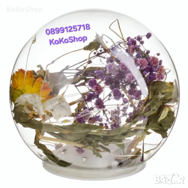 Светеща декоративна стъклена топка/лампа,с красиви сухи цветя. Съдържа 10 бр. LED лампички и работи с 3 броя батерии-тип ААА (батериите НЕ са включени).