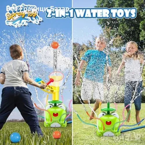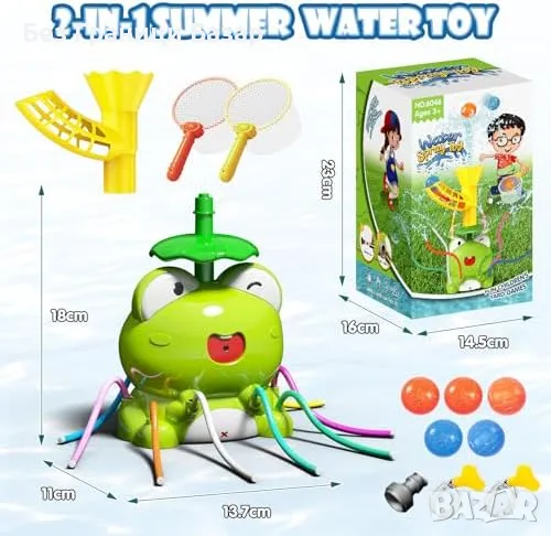 2-в-1 водна играчка – Фрог спринклер с въртяща се водна струя и изстрелване на топки.