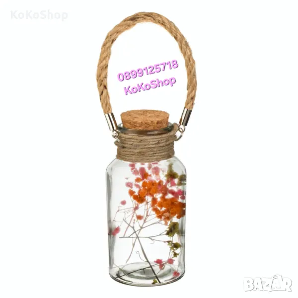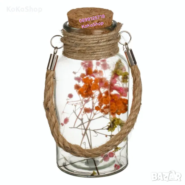 Светеща декоративна стъклена бутилка /лампа,с красиви сухи цветя. Съдържа 10 бр. LED лампички и работи с 3 броя батерии-тип LR41(батериите СА включени).