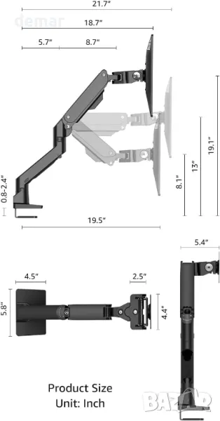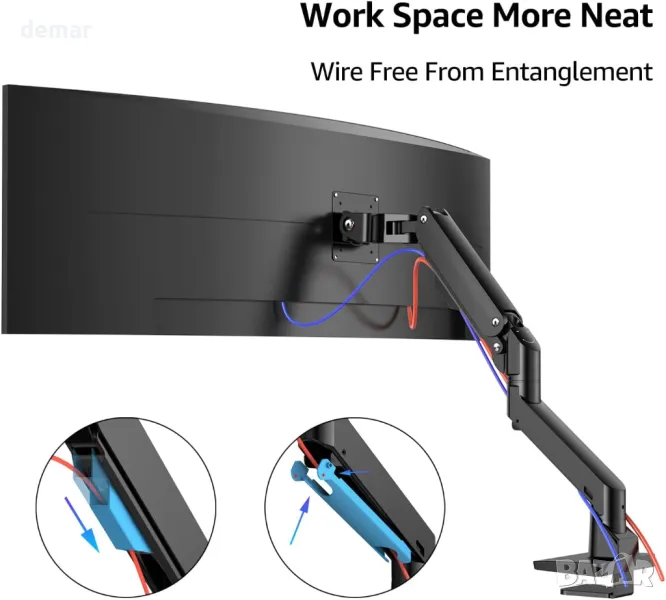 Мощно рамо за монитор, изработено от висококачествен алуминий, поддържа 10-20 кг, пасва на 34" до 49" ултрашироки и извити монитори, включително най-новия 57" модел на Samsung. Сигурен дизайн за монтиране на бюро със C-скоба или основа с втулка, пасва на бюра с дебелина до 6 см. Напълно регулируемо рамо с газова пружина за плавно движение, +90°/-15° наклон, Завъртане на +90°/-90° и завъртане на 360° за персонализирано гледане. Подсилената глава VESA с механични пружини предотвратява провисването, докато вграденото управление на кабела поддържа лесната инсталация с включен хардуер, насоки стъпка по стъпка и множество опции за монтаж.