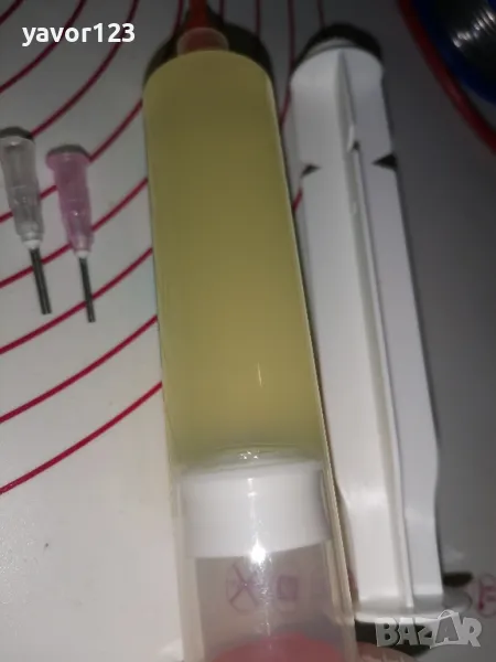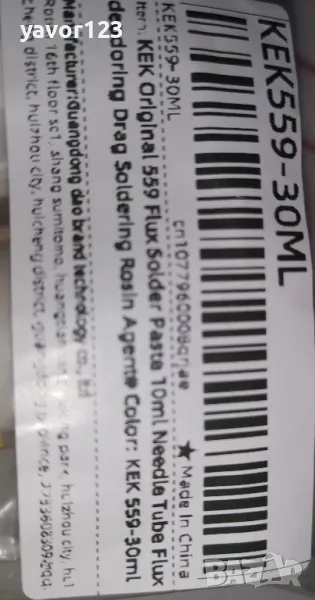Та сега за флюса: Изглежда малко по-прозрачна от Amtech NC-559-ASM от обявите ми и дими нормално и не е много, а средно към малко. Не мирише гадно както евтините имитации на имитациите. Има лек мирис може би на масло или и аз не знам на какво. Много добра консистенция, много лесно се изшприцва и бавно се разтапя само около човката на поялника. Също остава и по-прозрачна след като изстине и не остава лепкаво петно, а леко мазно и се чисти супер лесно. Показал съм на снимките как изглежда пастата върху платка и как изглеждат калайдисани кабелчета с нея. Лявото кабелче с Amtech NC-559-ASM, а дясното с KEK Original NC-559-ASM. Не разваля калайдисаното на човката на поялника и не го съсипва. Моето мнение е, че е много добър флюс. Ако искате да подсилите калайдисващото му действие или иначе казано да увеличите активността, добавете малко колофон към спойката, като по този начин няма да има корозивен ефект. Активноста на саммия флюс не е голяма, което е добре за да няма корозивен или негативен ефект върху спойките. И тъй като целта на този продукт е да се използва върху вече калайдисани повърхности, не е нужно да е активен. За тази цел има други пасти с висока активност и корозивност. Само от мен ще получите подробно описание и тест, както и реални снимки точно на съответния продукт както този сега. Като получа нова стока след добро проучване, я тествам и пиша тук каквото виждам, без да скривам негативи, както може да забележите от някои други мои обяви.