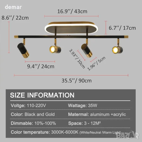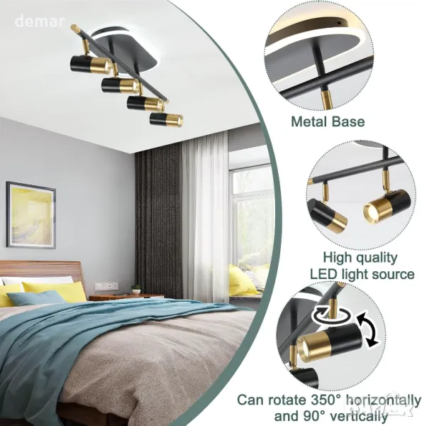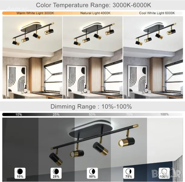 Димируемо 30W таванно осветление с регулируема яркост (10%-100%) и три цветни температури (3000K, 4000K, 6000K) чрез дистанционно управление. Разполага с модерен, елегантен дизайн с четири въртящи се глави на лампата (350° хоризонтално, 90° вертикално) за персонализирано осветление. Осветлението без трептене осигурява комфорт на очите, което го прави подходящ за четене или почивка. Идеален за различни вътрешни пространства, включително коридори, кухни, спални, всекидневни и търговски помещения.