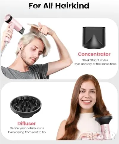 Практични аксесоари: 360° магнитен дифузер и концентратор за лесно оформяне на прическата.
