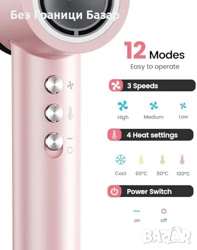 12 режима за сушене: 4 нива на топлина и 3 скорости, подходящи за всички типове коса.