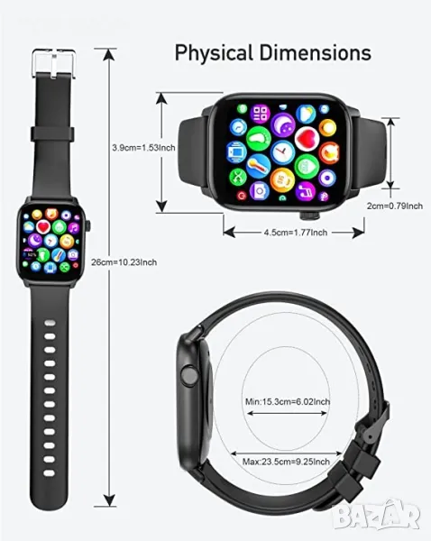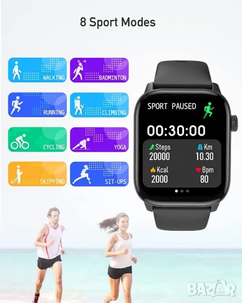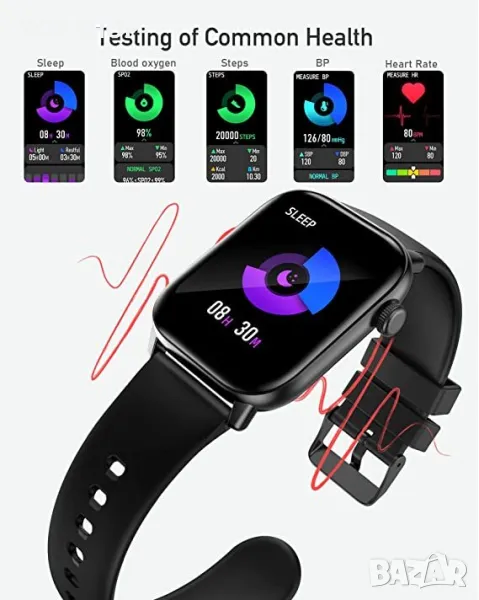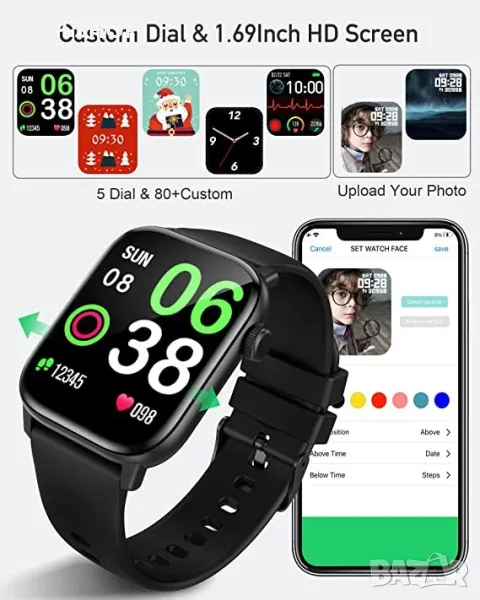- Голям циферблат и хуманизирани функции: Нашият 1,75-инчов цветен сензорен екран прави операцията лесна и можете лесно да преглеждате подробни отчети с данни на него или на телефона си с APP. Плюс разнообразие от препоръчани циферблати и DIY циферблати са удобни за показване По-практични инструменти, като будилник, таймер, камера и музикален контролер, регулируема яркост и т.н. Ние се ангажираме да работим с вас, за да създадем по-здравословен, по-активен и по-удобен начин на живот.